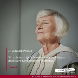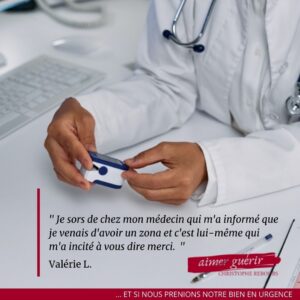 Je tiens à vous apporter remerciements. Je sors de chez mon médecin qui m'a informé que je venais d'avoir un zona et c'est lui-même qui m'a incité à vous dire merci. Les douleurs se sont interrompues et les boutons ne se sont plus propagés.