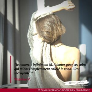 Mon mari remercie chaleureusement Monsieur Rebours pour l’avoir guéri d’un zona dont les brulures lui ont fait atrocement mal. Les médicaments n’ont pas pu le soulager comme l’a fait Mr Rebours. Que je regrette qu’il ne l’ait pas vu plus tôt ! Il aurait moins souffert !!!