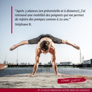 Suite à fracture de chaque scaphoïde des poignets, il y a plus de 20 ans, je n'arrivais plus à faire ne serait-ce que 8-10 pompes car je ressentais un vrai blocage mécanique des articulations. Après 3 séances (en présentielle et à distance) en 6 mois, j'ai retrouvé une mobilité des poignets qui me permet de refaire des pompes comme à 20 ans (environ 30 à 50).