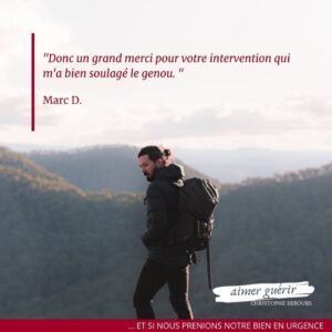 Ma fille de 8 ans a subitement cessé de marcher en évoquant des douleurs aux jambes. Au bout d'un mois, j'ai fait appel à Christophe Rebours. Nous avons organisé une séance à distance pour ma fille. Elle a remarché le lendemain. Aujourd'hui, elle court comme un cabri. Merci Christophe pour l'incommensurable soulagement que ce soin a apporté à notre famille.