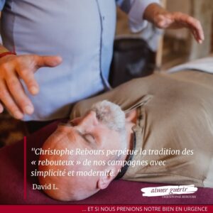 Par son écoute et sa bienveillance, Christophe Rebours apaise déjà. Son don de magnétisme peut alors faire son œuvre. Pour moi-même et pour mes proches il a pu apaiser des douleurs parfois anciennes et non soulagées par la médecine traditionnelle. Il perpétue la tradition des « rebouteux » de nos campagnes avec simplicité et modernité. Une vraie belle rencontre et une belle énergie au service des autres. Merci !