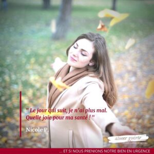 Je suis très contente d’avoir fait votre connaissance. Cela fait plusieurs fois que l’on se voit. Je suis très satisfaite des soins que vous m’apportez. Grâce à eux, vous me soulagez. Le jour qui suit, je n’ai plus mal. Quelle joie pour ma santé ! Je vous remercie beaucoup.