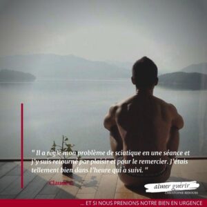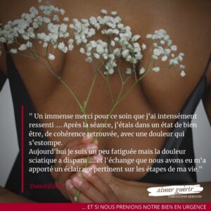 Un grand merci pour ce soin que j'ai intensément ressenti. Après la séance j'étais dans un état de bien être, de cohérence retrouvée avec une douleur qui s'estompe. Aujourd'hui, je suis un peu fatiguée mais la douleur de sciatique a disparu et l'échange quye nous avons eu m'a apporté un éclairage pertinent sur les étapes de ma vie.