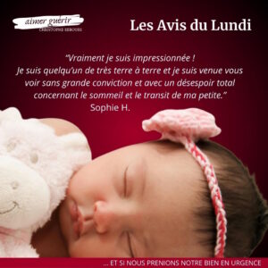 Petit retour après 10 jours. Eva fait la plupart du temps ses nuits. Il y a quelques réveils encore mais rien à voir. Je suis quelqu’un de très terre à terre et je suis venue vous voir par du bouche à oreille mais sans grande conviction et avec un désespoir total concernant le sommeil et le transite de ma petite. Vraiment je suis impressionnée !
