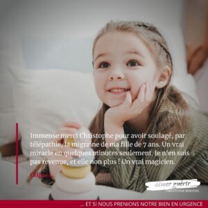 Immense merci Christophe pour avoir soulagé par télépathie la migraine ma fille de 7 ans. Un vrai miracle en quelques minutes seulement. Je n'en suis pas revenue, et elle non plus ! Un vrai magicien.