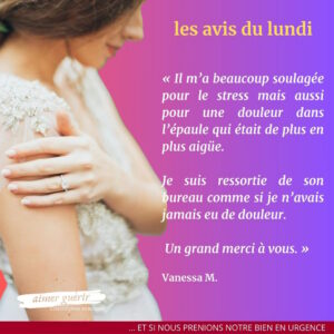 C’est une personne bienveillante, très souriante et surtout à l’écoute. Il m’a beaucoup soulagée pour le stress mais aussi pour une douleur dans l’épaule qui était de plus en plus aigüe. Je suis ressortie de son bureau comme si je n’avais jamais eu de douleur.