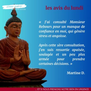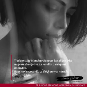 J'ai consulté Monsieur Rebours, pas pour un souci de santé, mais plutôt un manque de confiance en moi, qui génère stress et angoisse. Après cette 1ère consultation, j'en suis ressortie apaisée, soulagée et un peu plus armée pour prendre certaines décisions. Un grand MERCI à Monsieur Rebours. »