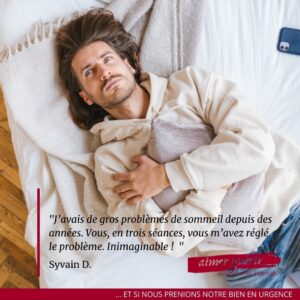 On m’avait prévenu, mais je ne voulais pas y croire. C’est vrai, vous êtes vraiment incroyable ! J’avais des problèmes de sommeil depuis des années. Je mettais des heures à m’endormir et me réveillais régulièrement la nuit. Vous, en trois séances, vous m’avez réglé le problème. Inimaginable ! Merci Monsieur Rebours de m’avoir redonné goût à mes jours et à mes nuits.