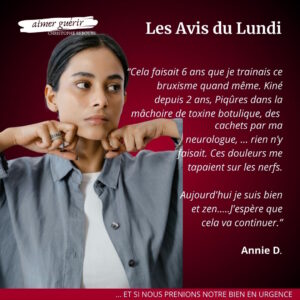 Cela faisait 6 ans que je trainais ce bruxisme quand même. Ces douleurs me tapaient sur les nerfs. Depuis jeudi que je suis venue, les principales douleurs ont disparues. J’ai encore une légère sensation de dents endormies. Par contre ma mâchoire est beaucoup mieux, je la sens légère. JE REVIS. Je pense en effet que vous avez trouvé l'origine. Aujourd'hui je suis bien et zen.....