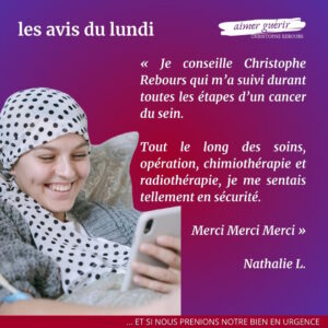Je conseille Christophe Rebours qui m’a suivi durant toutes les étapes d’un cancer du sein. Il a commencé par me soulager à la pose du cathéter. J’avais une mauvaise plaie douloureuse. Dès le lendemain, c’était miraculeux, plus de douleurs et complètement dégonflé. Tout le long des soins, opération, chimiothérapie et radiothérapie, je me sentais tellement en sécurité avec Christophe.