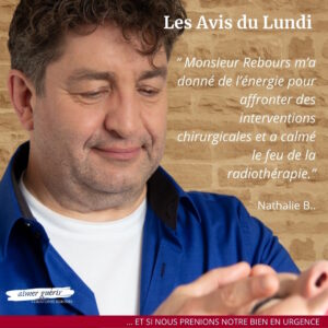 Parfois dans la vie, le corps lâche et la tête suit, … ou l’inverse. On bascule dans le stress et la maladie. Monsieur Rebours m’a aidé à apaiser mon stress et des douleurs. Il m’a donné de l’énergie pour affronter des interventions chirurgicales et a calmé le feu de la radiothérapie. Merci pour votre aide votre bienveillance votre force. »